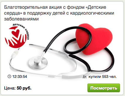 Помочь в краудфандинге для социальных проектов, используя многомиллионную аудиторию активных покупателей, решил российский Groupon – сайт коллективных покупок. Покупая купон на этом сайте, клиент может существенно сэкономить средства на понравившуюся услугу, а сайт получит свой процент за привлечение новых клиентов в ту компанию, которая эту услугу оказывает. В случае с благотворительностью все немного проще – каждый желающий может просто приобрести любое количество купонов стоимостью 50 рублей, а все средства будут переведены на счет фонда.
