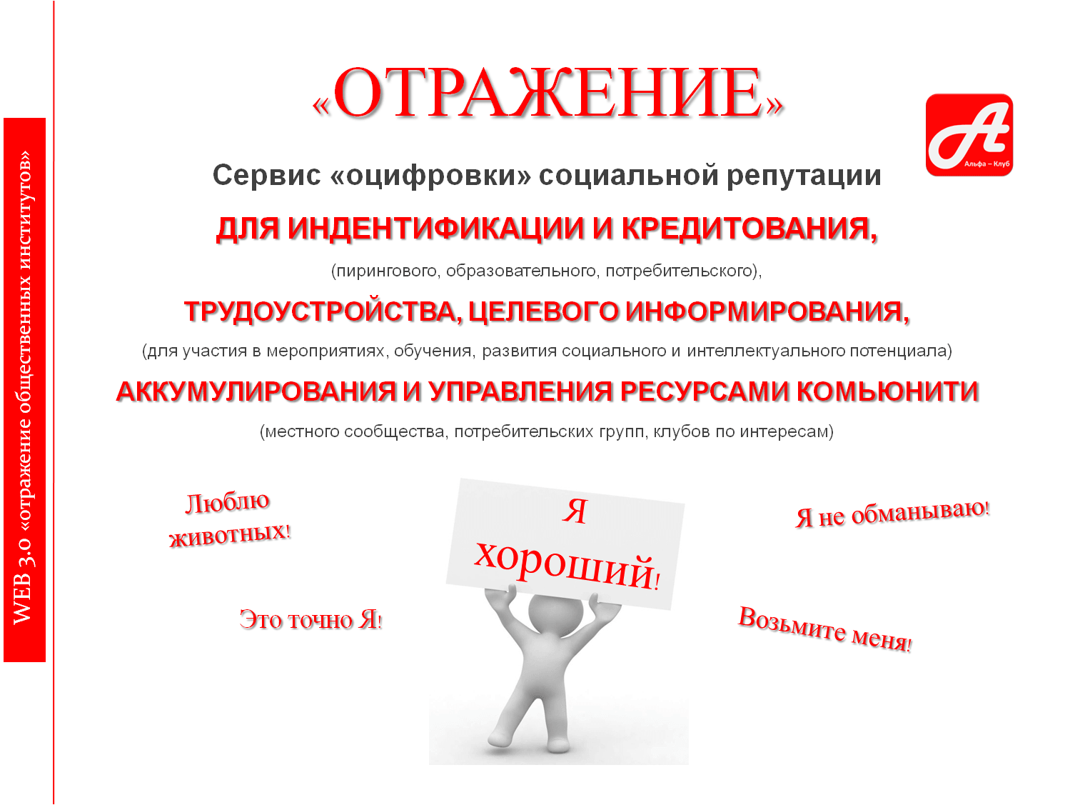 Я хочу решить проблему: «Оцифровки» социальной репутации молодежи, создания условий для целевого информирования молодежи о государственных и не государственных услугах в области культуры, образования, спорта и молодежной политики, образовательного кредитования, аккумулирования и управления ресурсами комьюнити (местного сообщества, потребительских групп, клубов по интересам), 100% идентификации для участия в референдумах, публичных обсуждениях законопроектов.