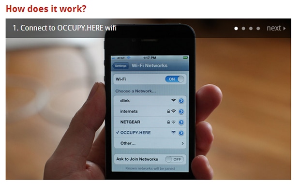 Occupy.here – это анонимная одноранговая (peer-to-peer) виртуальная сеть для открытых политических дискуссий. Любой человек со смартфоном или ноутбуком, находящийся в пределах доступа Occupy.here wifi-роутера, может присоединиться к сети “OCCUPY.HERE”, загрузить локальный веб-сайт occupy.here и использовать простой и удобный форум для связи с другими пользователями.