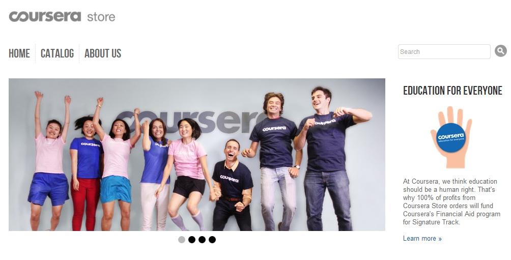 Одним из способов монетизации и пиара онлайн-проекта является магазин. Coursera, известная платформа бесплатного онлайн-образования, запустила онлайн-магазин — теперь у всех поклонников Coursera появилась возможность приобрести футболки, чашки, наклейки и бутылки для воды с логотипом ресурса.