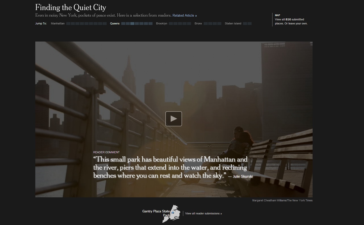 В приложении от The New York Times жители Нью-Йорка делятся друг с другом своими тайными местами и отмечают их на карте. Сайт завораживает своими видео и фотографиями, время на нем останавливается. Пользователи сайта добавили уже 816 подобных мест.