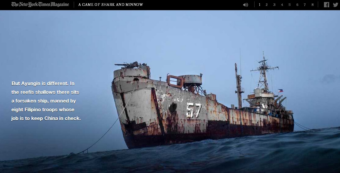 Материал «A Game of Shark and Minnow», повествующий о о геополитической войне за острова в Южно-китайском море между Китаем и Филиппинами, начинается с видео с рыбацкой лодки, «видавшей лучшие дни», на которой авторы материала плывут к BRP Sierra Madre — заброшенному американскому кораблю, расположенному в 105 морских милях от Филиппин и ставшему местом борьбы за контроль в Южно-Kитайском море.