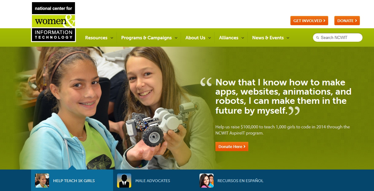 National Center for Women & Information Technology привлекает женщин в области, связанные с технологиями: учит программированию в школах, финансирует создание образовательных программ и поддерживает женщин, работающих и создающих бизнес в сфере интернет-технологий.