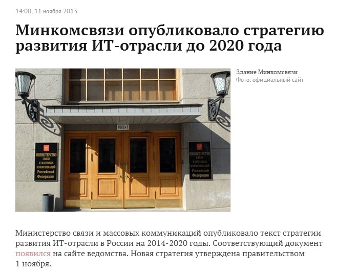Министерство Связи и массовых коммуникаций представило текст стратегии развития ИТ-отрасли в России на 2014-2020 годы, утвержденной правительством 1 ноября.