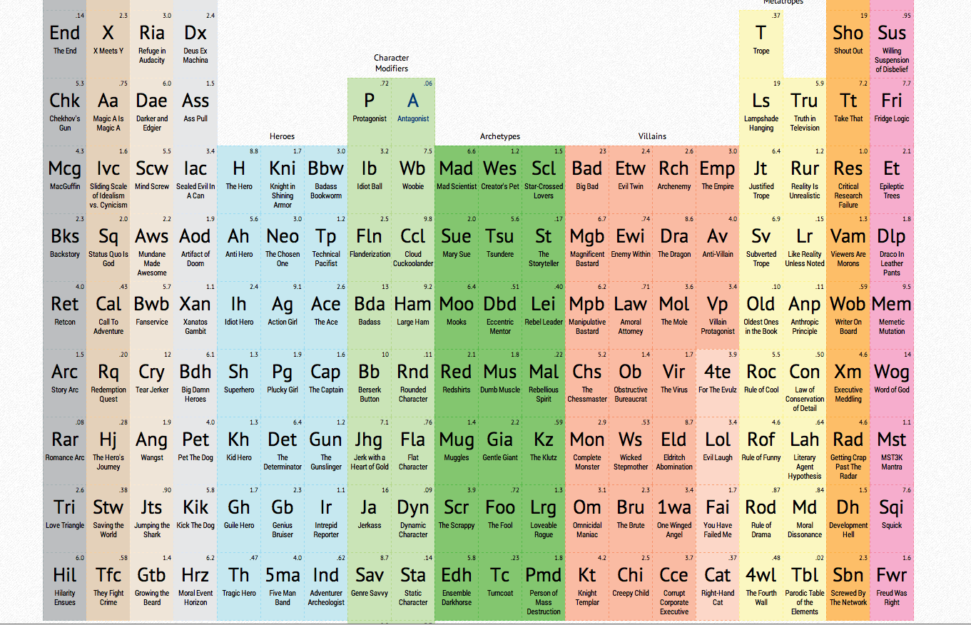 Каждый элемент, cодержащийся в таблице, имеет свое идентификационное имя и принадлежит к конкретной категории; готовые рецепты известных фильмов представлены ниже, прямо под таблицей. Создатель проекта Джэймс Харрис отмечает, что все собранные им элементы ни в коем случае не являются клише, он не умаляет их оригинальности, к чему и призывает остальных пользователей Сети.