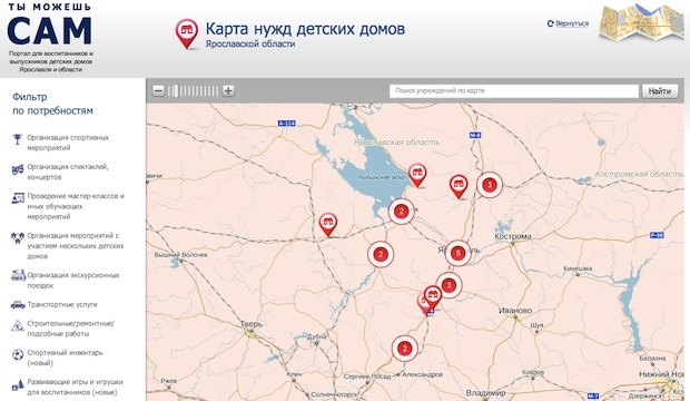 дома области. Рядом находится поле с разделами – нуждами детских домов. Каждый раздел помечен своим значком для удобного поиска по ним. Среди таких разделов – помощь в организации спортивных мероприятий, концертов, транспортные услуги, спортивный инвентарь и другие. Перечень нужд разрабатывался совместно с Департаментом образования Ярославской области, который оказал значительную поддержку проекту. Каждый детский дом на карте отмечен маркером. При его открытии виден перечень потребностей дома, а также контактная информация.