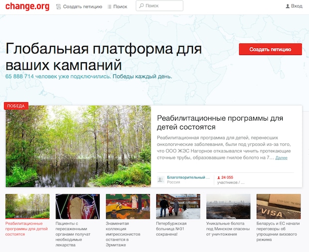 Каждый день на Change.org более 40 миллионов посетителей из 196 стран используют онлайн-инструменты для того, чтобы изменить к лучшему жизнь в своих локальных, национальных и глобальных сообществах. Тысячи кампаний, запущенных на Change.org совершенно разными людьми, уже победили: мать остановила издевательства над детьми в школе, в которой училась ее дочь; клиенты банков отменили несправедливые дополнительные налоги; граждане добились сохранения уникальной больницы… Ежедневно авторы новых кампаний на Change.org одерживают свои победы. Вы можете уже сегодня начать свою кампанию и собрать тысячи единомышленников и сторонников вашей инициативы.
