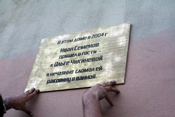 Недавно в центре Петербурга появились мемориальные таблички с упоминанием обычных горожан: «В этом доме в 2004 году Иван Семенов пришел в гости к Ольге Чикиневой и нечаянно сломал ей раковину в ванной». Авторы проекта — уличные художники Gandhi, а сама акция называется «В этом доме свет не гаснет».