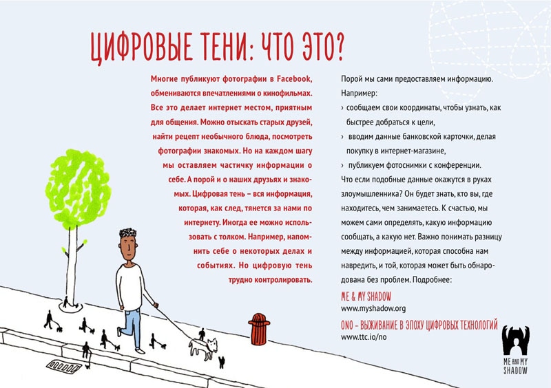 Сайт Me & My Shadow ( Я и моя тень) разработан компанией Tactical Technology Collective и теперь доступен на русском языке. Его цель – помочь узнать больше о цифровой „тени“, которая тянется за пользователями интернета. Ресурс предлагает подобрать инструменты, чтобы изменить размеры и форму этой тени, а также узнать, как вы, ваша семья и ваши друзья могут укрепить свою безопасность в цифровом мире.