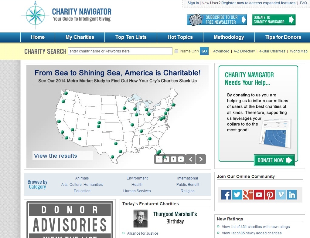 «Charity Navigator» – самая крупная экспертная структура в США, занимающаяся рейтинговой оценкой благотворительных организаций. В 2012 году счетчики сайта зафиксировали более 6,2 миллиона посещений, организация способствует росту пожертвований примерно на $10 миллиардов ежегодно.