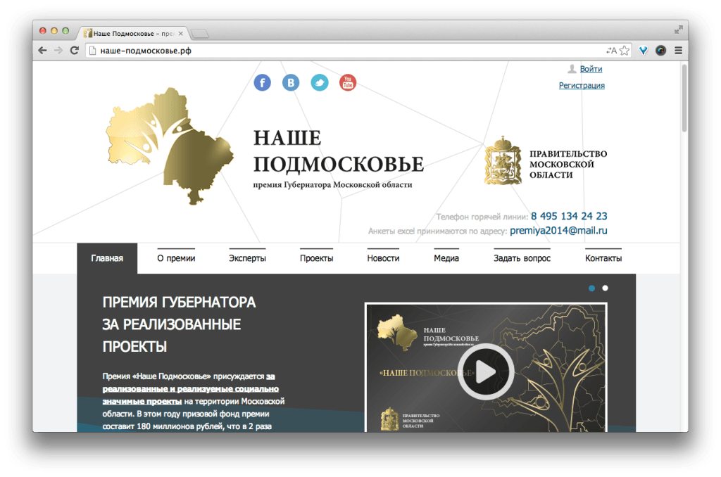 Премия «Наше Подмосковье» присуждается за реализованные и реализуемые социально-значимые проекты на территории Московской области. В этом году призовой фонд премии составит 180 миллионов рублей, что в два раза превышает размер фонда 2013 года. Заявки принимаются до 30 августа 2014 года.