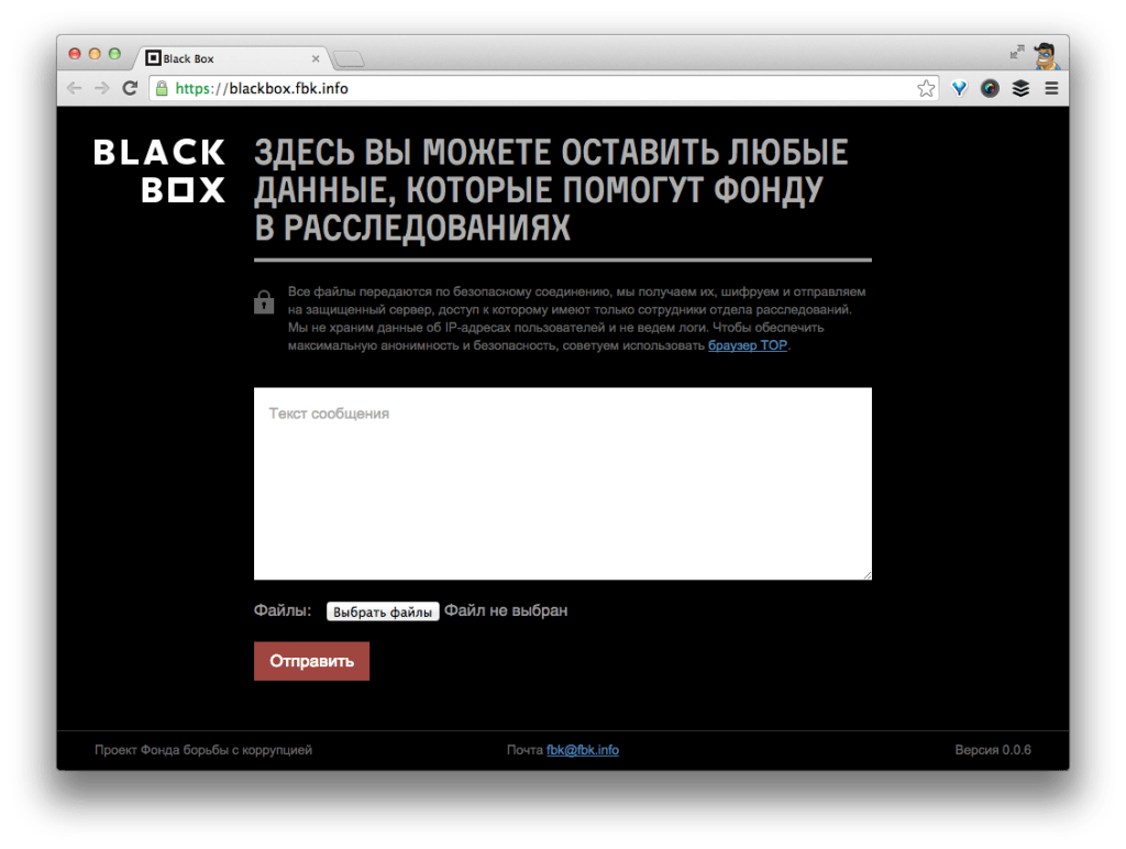 Black Box позволяет оставить любые данные анонимно, которые помогут Фонду борьбы с коррупцией* (признан в России иноагентом, а также экстремистской организацией и запрещен) в расследованиях.
