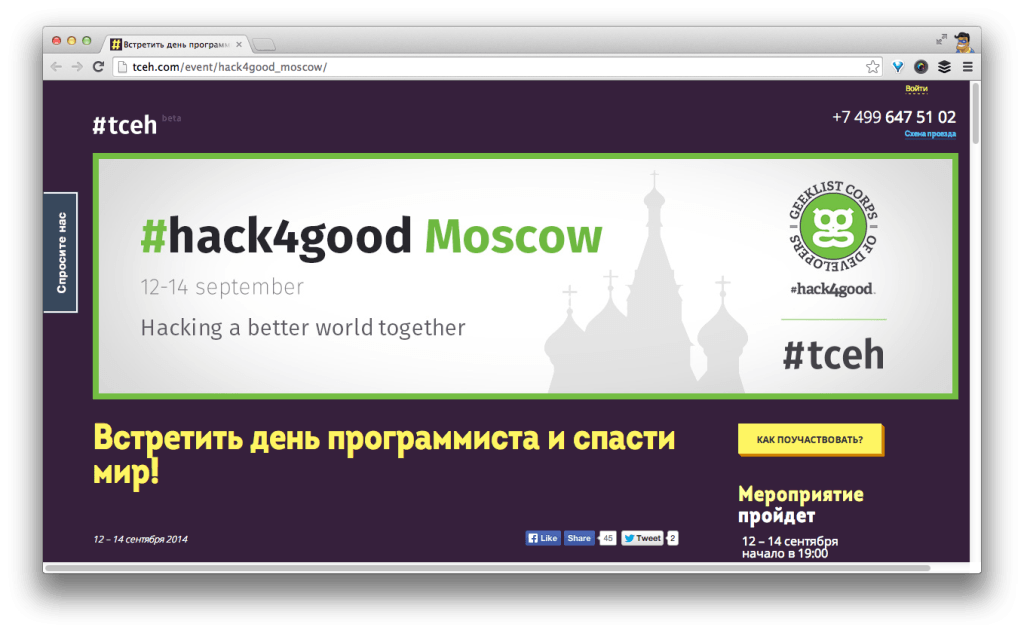 Pегистрация на хакатон представляет собой отдельный квест. После перехода найдите кнопку участия справа вверху экрана: если у вас нет профиля на Geeklist, придется завести его прямо в процессе (рассказать о своих скиллах и т.д.). Все на английском. Это займет несколько минут. Остальная информация на английском сайте дублирует ту, что вы уже прочли здесь. Одолейте босса и приходите!