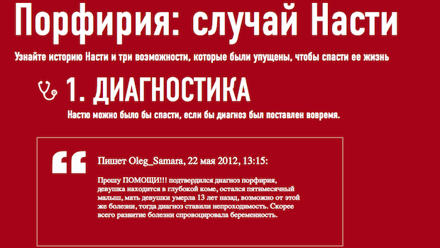 Порфирия: случай Насти – это сайт, созданный при поддержке Теплицы социальных технологий на Здрав-Camp, творческой мастерской по разработке онлайн-продуктов для информирования сообщества о редких и опасных заболеваниях, который проходил в Москве в марте 2014 года.