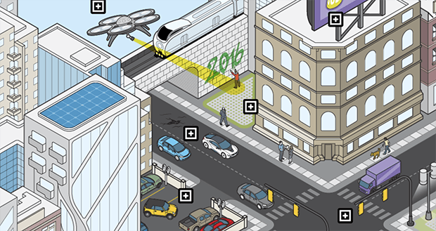 Wired опубликовал интерактивную иллюстрацию, на которой изображен город ближайшего будущего, использующий новые технологии.