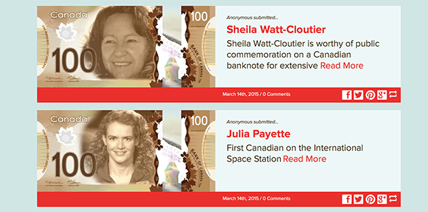 Инструмент действительно оказался очень популярным – вскоре после запуска сайта пользователи добавили десятки женщин-кандидатов на то, чтобы появиться на новых банкнотах – от астронавта Роберты Бондар и бывшего премьер-министра Ким Кэмпбелл до кантри-певицы Шанайи Твейн.