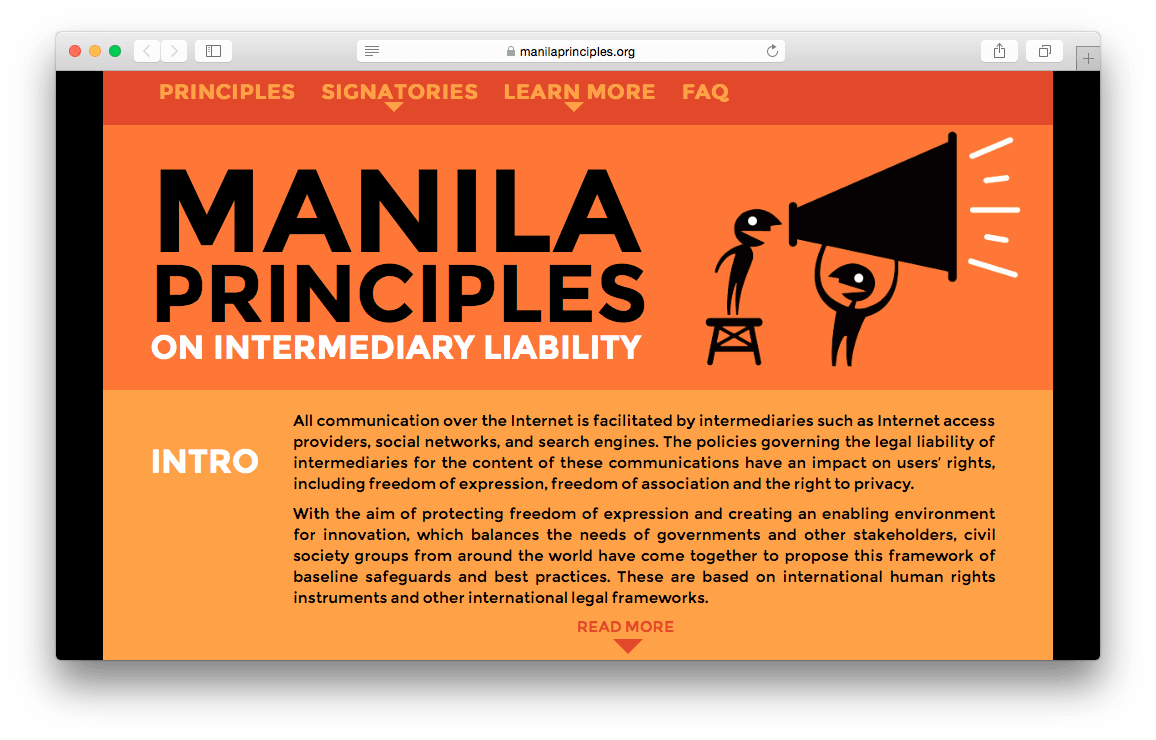 На конференции в Маниле международная коалиция правозащитных организаций и Фонд электронных рубежей (EFF) представили Манильские принципы – договор, который призван гарантировать свободу слова и самовыражения в Интернете.