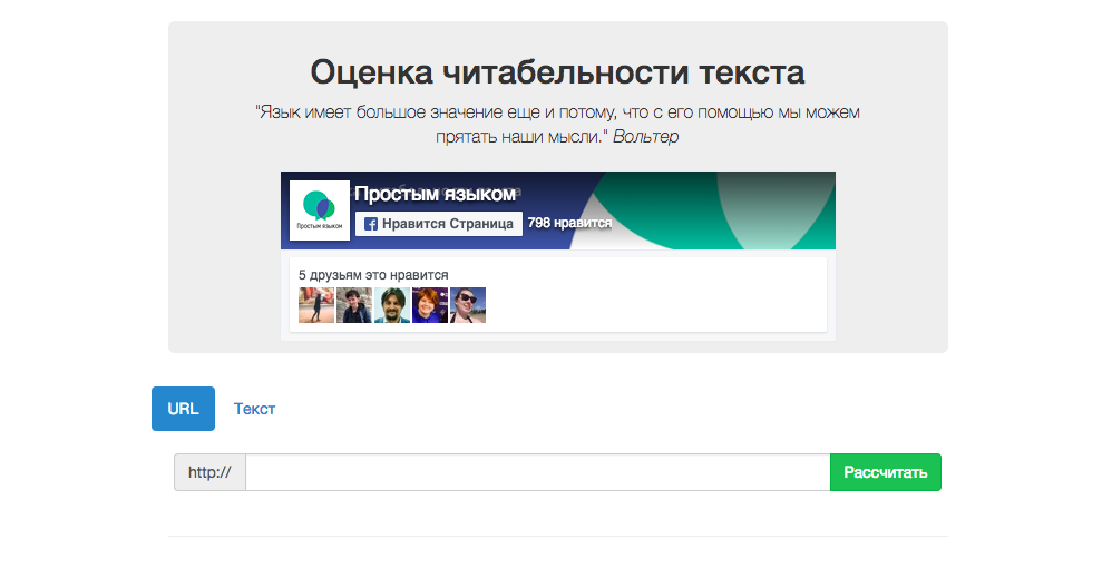 Чтобы проверить читабельность вашего текста, нужно зайти на сайт сервиса. Без регистрации вы просто вставляете url-ссылку на вашу статью или сам текст и нажимаете на кнопку «рассчитать».