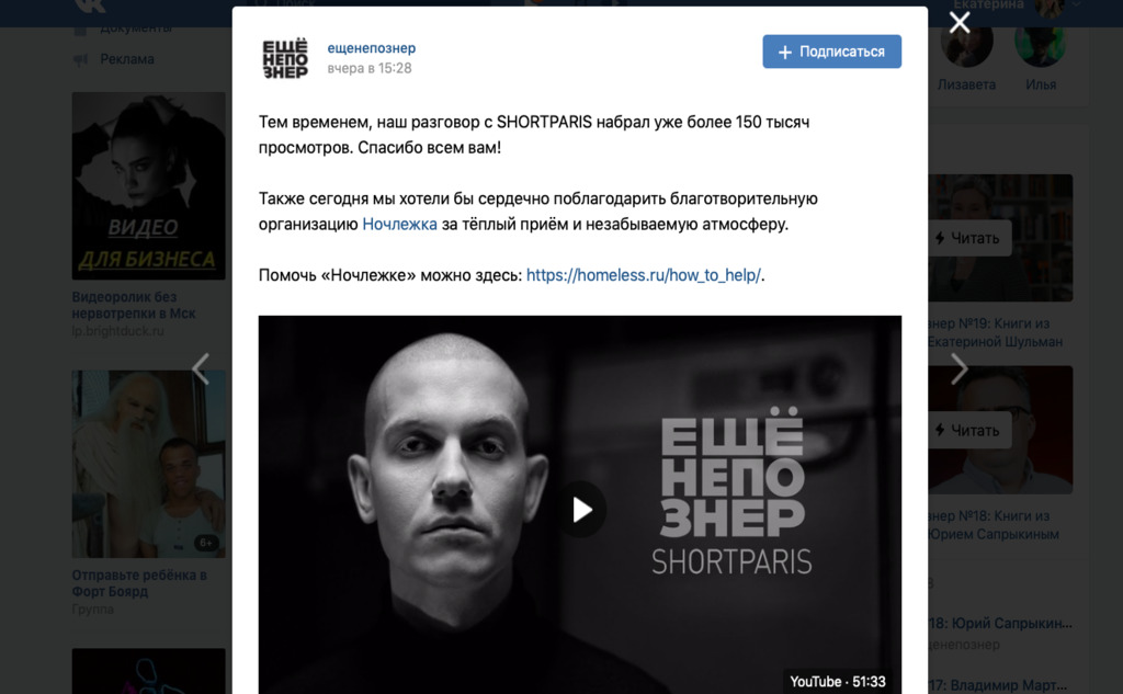 Еще один пример — партнерство «Ночлежки» и проекта ещенепознер. Новый выпуск программы был записан в «Культурной прачечной» для бездомных людей. Съемки прошли в выходные дни, когда прачечная была закрыта. Команда проекта получила бесплатное пространство для съемок интервью взамен разместив в своей группе ссылку на реквизиты организации и призыв помогать «Ночлежке».