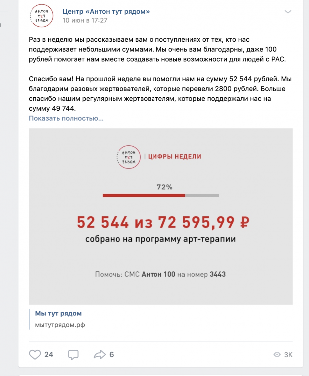 «Вся ваша помощь приносит значимый результат: собранная за прошлую неделю сумма поможет нам покрыть 72% месячного бюджета занятий арт-терапией. А это огромный вклад в бюджет и работу центра. На занятиях студенты, взрослые люди с аутизмом получают возможность выплеснуть эмоции и научиться лучше концентрироваться на своих чувствах и ощущениях и понимать их».