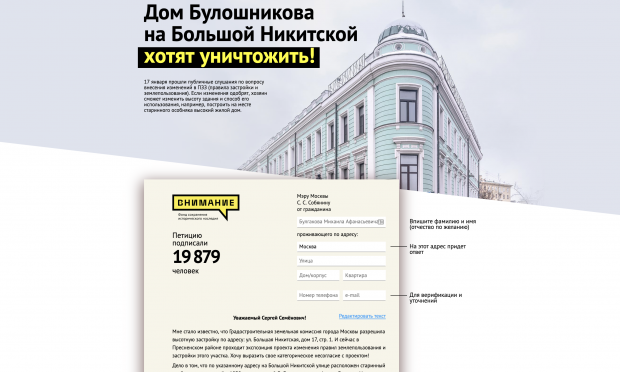 На красноречиво составленную бумагу без ссылок на юридические документы чаще всего приходит формальная отписка. Не поленитесь изучить законодательство по охране памятников, оно не столь объемно. Идеальный образец письма для градозащитной кампании был составлен в январе 2019 года – за защиту дома Булошникова высказались 20 тысяч человек со всей страны.