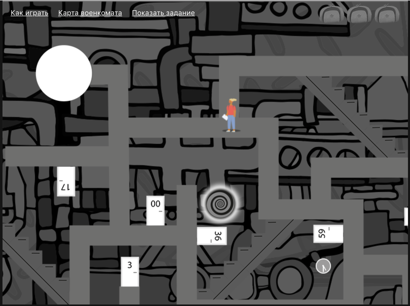 Интерфейс игры, призывнику необходимо занести документ в нужный кабинет.