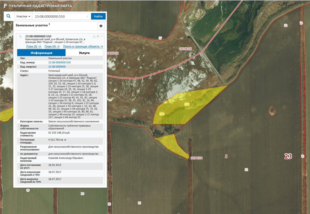 Например, на скриншоте с публичной кадастровой карты видно, что в собственность ОАО «Родина» был отдан кусок реки Ясени в Ейском районе Краснодарского края. Кадастровый инженер посчитал эту территорию землями сельскохозяйственного назначения. С помощью ГИС можно, не выходя из дома, убедиться, что это именно территория реки. На этом основании было составлено обращение в Ейскую межрайонную прокуратуру, которая признала факт передачи куска реки в собственность и потребовала признать сделку недействительной.