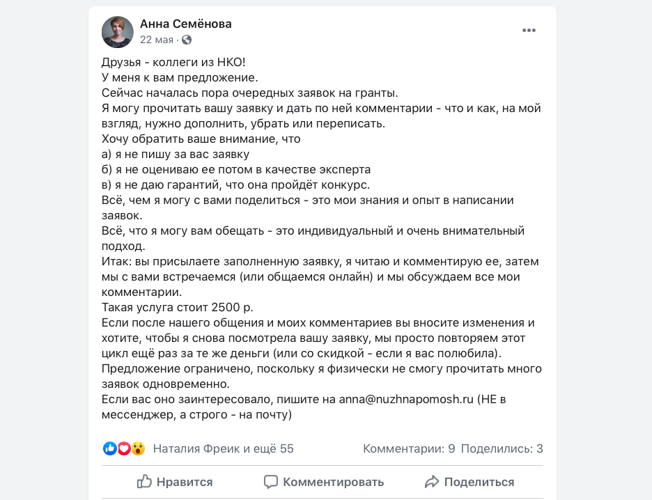 Различные платные и бесплатные консультации практиков сектора по подготовке грантовых заявок. Как правило, это серая зона, где совершаются сделки между знакомыми людьми. Довольно редко такие предложения выходят в паблик. Например, директор БФ «Нужна помощь» Анна Семенова на своей странице в Facebook предлагала дать рекомендации по подготовленной заявке дружественным НКО за пожертвование в фонд.