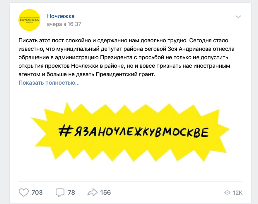«Случай с Савеловским показал, что в Москве «Ночлежка» недостаточно много рассказывала о себе. К тому же мы не были готовы переключиться от привычной дружелюбной атмосферы наших сообществ к тону напряженного спора, в котором мы вынуждены отстаивать право делать свою работу. Поэтому мы продолжаем говорить о проектах, о людях, которые приходят за помощью, отвечаем на вопросы и работаем над тем, чтобы «Ночлежка» как можно скорее начала помогать бездомным людям в Москве». Мария Калинкина
