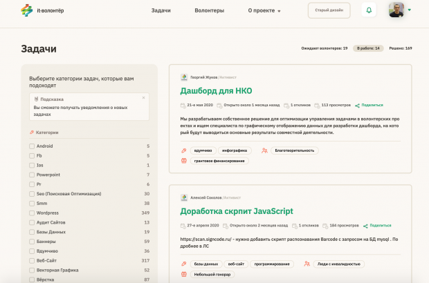 Команда «Теплицы» обновила платформу «IT-волонтёр». Дизайн стал более легким и современным, добавлены новые элементы и функции, а в интерфейсе акцент сделан на работу над задачей. Это значит, что сотрудники некоммерческих организаций смогут быстрее находить волонтеров, связываться с ними и оперативнее решать задачи.