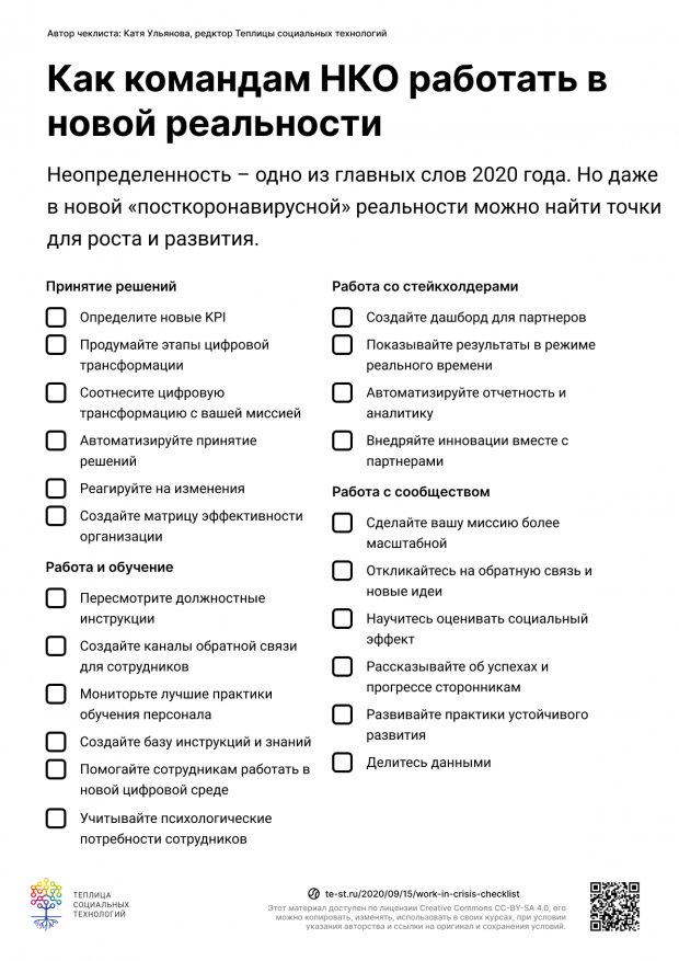Некоммерческие организации оказались в новой «посткоронавирусной» реальности. Команды НКО все чаще сталкиваются с неопределенностью. Экономика, вероятно, еще не скоро отойдет от удара, который нанесла пандемия. Чтобы продолжить работу, привлекать новых сторонников и развиваться, командам НКО нужно иметь антикризисный план. Составить его поможет чеклист, который журналистка Теплицы Екатерина Ульянова подготовила по материалам пособия компании Salesforce.