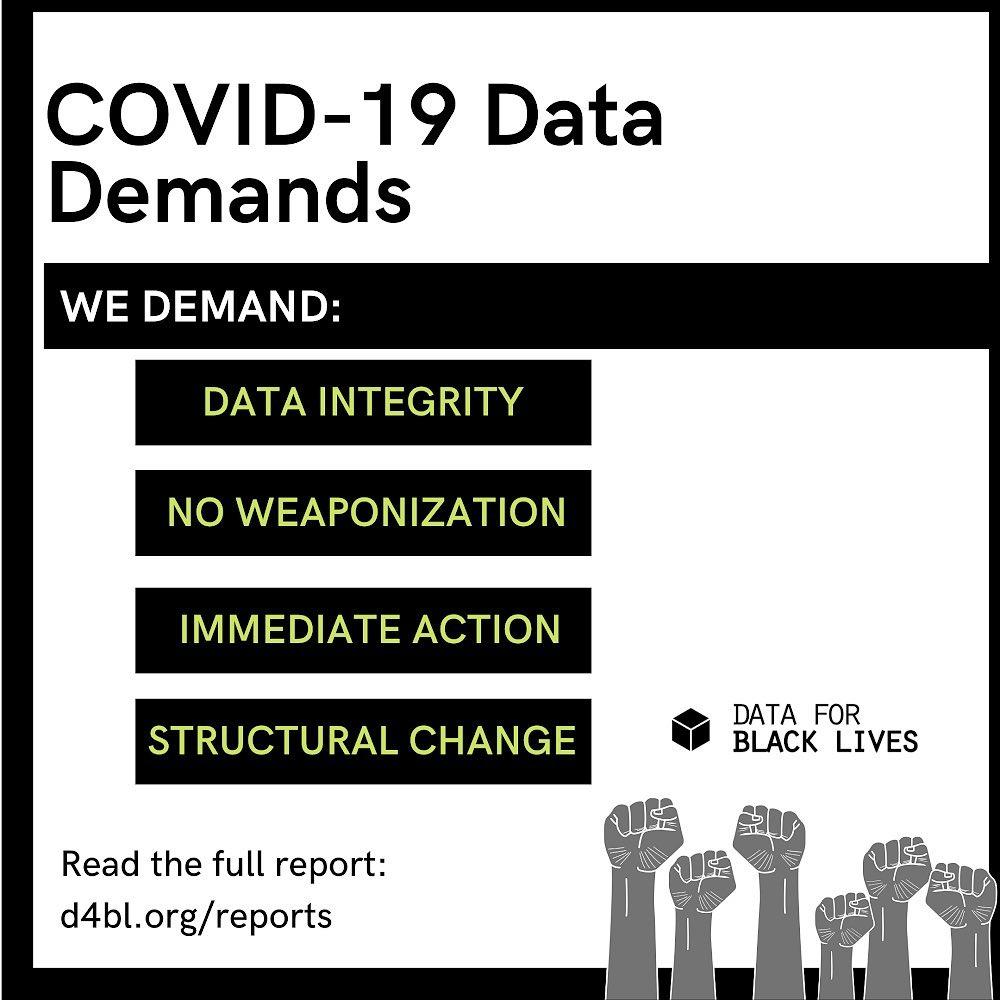 С распространением Covid-19 в США активисты D4BL начали требовать от государства большей открытости данных о том, как темнокожие люди переживают пандемию. На момент написания этой статьи активисты движения продолжают совместными усилиями формировать две таблицы: по смертности темнокожего населения от Covid-19 и по штатам, (не) учитывающим расу в статистике смертности. Для движения D4BL такие таблицы значимы, потому что отсутствие данных о смертности среди темнокожего населения не позволяет получить полную картину о том, как разные группы населения переживают пандемию и какую роль в этом может играть расовое неравенство.