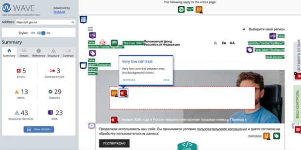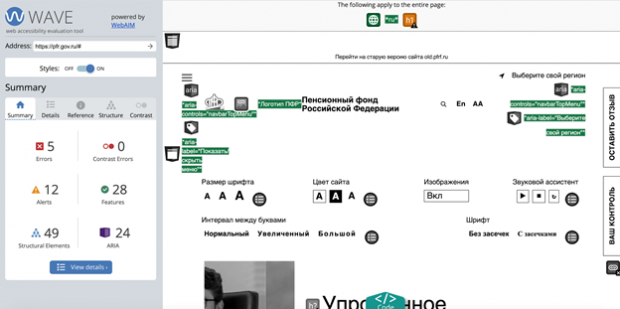 Для использования WAVE ничего дополнительно устанавливать не требуется, вы просто заходите на сайт проекта и вводите ссылку на интересующий ресурс. Вот так выглядит результат анализа сайта Пенсионного фонда: