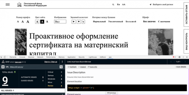 Axe – это плагин для браузера Chrome. Результат его работы с сайтом Пенсионного фонда тоже показателен: