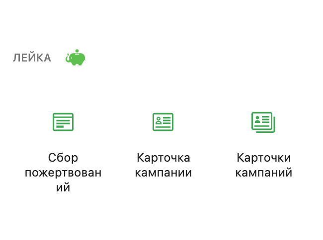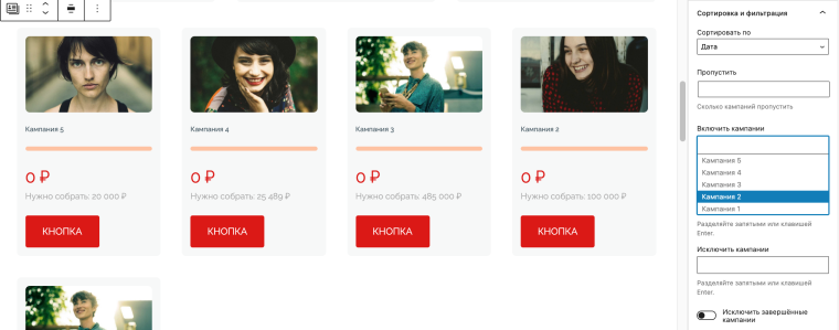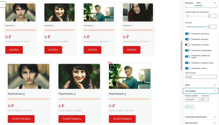 Блок «Карточки кампаний» позволяет выбрать и отобразить сразу несколько кампаний. В настройках блока можно выбрать количество карточек и количество колонок, указать заголовок. Внешний вид — отображение заголовка, изображение, описание, прогресс-бар, собранная сумма, целевая сумма, цвет и текст кнопки — также настраивается для всех карточек одновременно.
