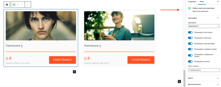 Блок «Карточка кампании» позволяет вывести карточку одной кампании. Для того чтобы вывести две в ряд, нужно использовать дополнительный блок «Колонки». В настройках можно менять внешний вид карточки: включать и отключать отображение заголовка, изображение, прогресс-бар, собранную сумму, целевую сумму, кнопку, а также задать текст кнопки и настроить цвета блока.