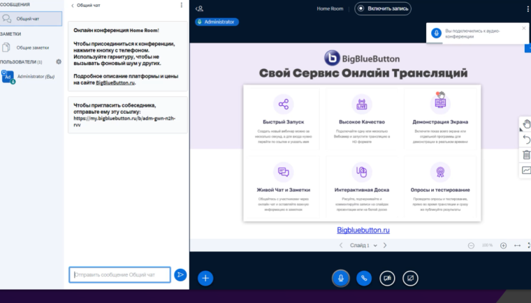 - BigBlueButton. Открытое программное обеспечение, изначально предназначено для дистанционного обучения — «виртуальный класс, созданный с нуля специально для учителей». Доступен на 65 языках, в том числе на русском. Помимо возможности показа презентаций и документов, поддерживает расширенные возможности доски — указатель, масштабирование и рисование, доступ к рабочему столу. Для обратной связи есть публичные и приватные чаты.