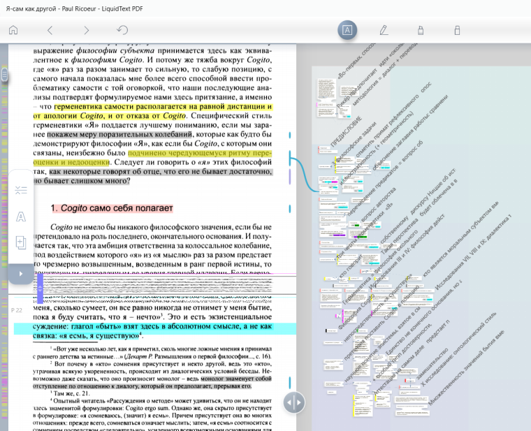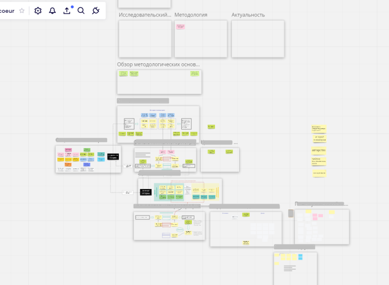 При работе над этой схемой я параллельно вела схематические конспекты в другом приложении — LiquidText, но оказалось, что оно не позволяет вытащить наработки в том виде, который позволяет создавать mindmap со связями между цитатами, поэтому я со спокойной совестью перевела этот процесс в Miro.