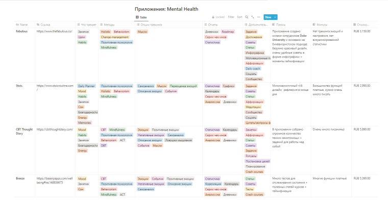 Я быстро разобралась в Notion — там очень удобно составлять базы знаний. Например, я делала базу знаний по переезду. Моя гордость — открытые для моих друзей базы знаний по разным областям, к примеру, по философии психиатрии и бизнес-аналитике.