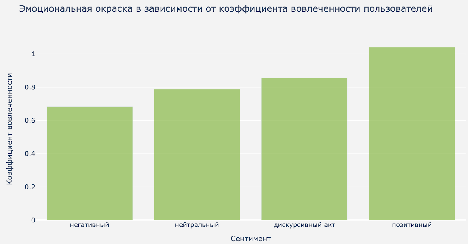 Что касается сентимента, коэффициенты вовлеченности и охвата постов ВКонтакте наиболее высокие для позитивно-окрашенных постов. На втором месте по коэффициентам вовлеченности и охвата посты типа «дискурсивный акт», то есть такие посты, которые могут содержать призывы, обращения и т.д. Потом идут нейтральные посты. Негативно-окрашенные посты имеют наименьшие коэффициенты охвата и вовлеченности, что ожидаемо.