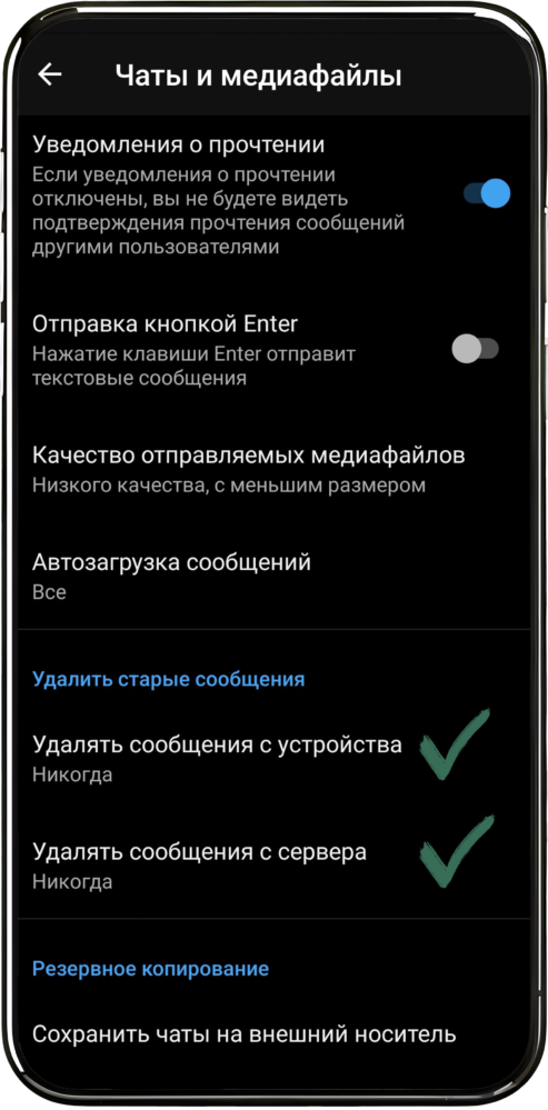 - Поставить таймер на регулярное автоудаление сообщений из приложения и с сервера, что мы настоятельно рекомендуем сделать;