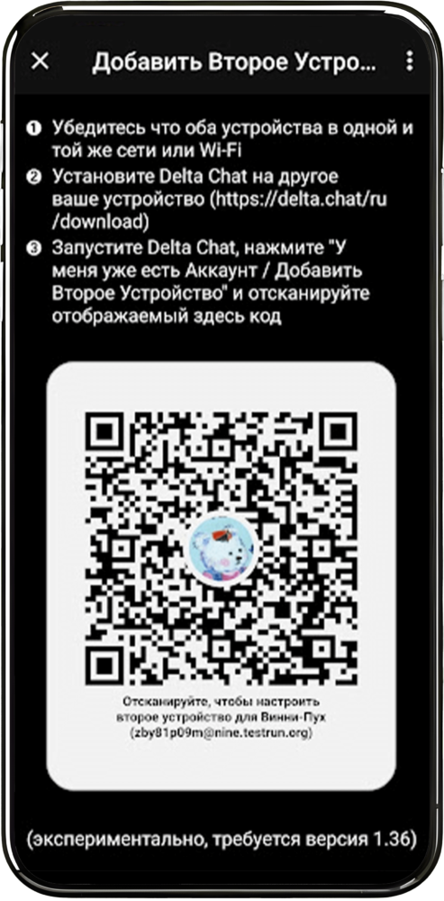 - Сохранить ваш QR-код как картинку или сделать скриншот и отправить его в другом защищенном мессенджере. Delta Chat подгрузит QR-код из галереи устройства («сканировать» QR-код → «загрузить QR-код как изображение»);