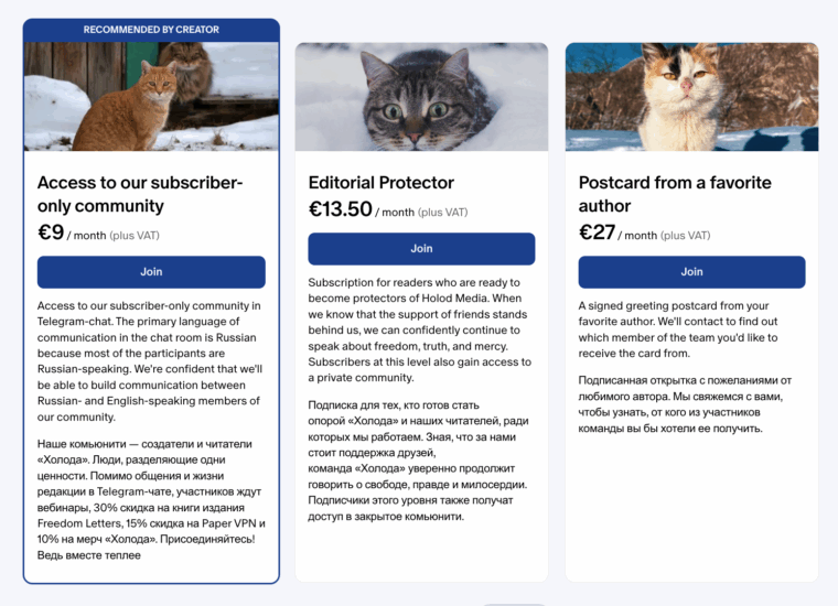 Удачным примером того, как можно выстраивать такое комьюнити донаторов, является Patreon-страница издания «Холод»: они рассылают «патронам» открытки, приглашают их в закрытый чат и Zoom-встречи.