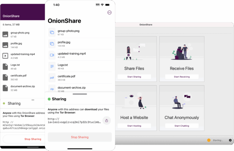 OnionShare превращает ваш компьютер во временный onion-сервис внутри сети Tor. Разработчики — американское НКО Freedom of the Press Foundation. Использование Tor дает как плюсы (пожалуй, это самый защищенный и анонимный протокол на планете), так и минусы.