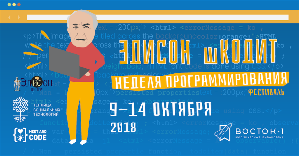 С 9 по 14 октября в Космической библиотеке востока Москвы «ВОСТОК-1» пройдет Фестиваль программирования «Эдисон шКодит». Мероприятие организовано Учебным центром «Эдисон» и Централизованной библиотечной системой ВАО Москвы в рамках инициативы Meet and Code и Европейской недели программирования.