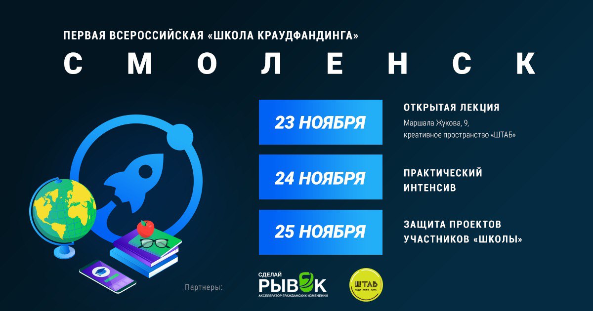 Социальные предприниматели Смоленска могут принять участие в бесплатной образовательной школе краудфандинга с 23 по 25 ноября 2018 года. Участников научат использовать краудфандинг для финансирования и продвижения проектов. Подать заявку необходимо до 21 ноября.