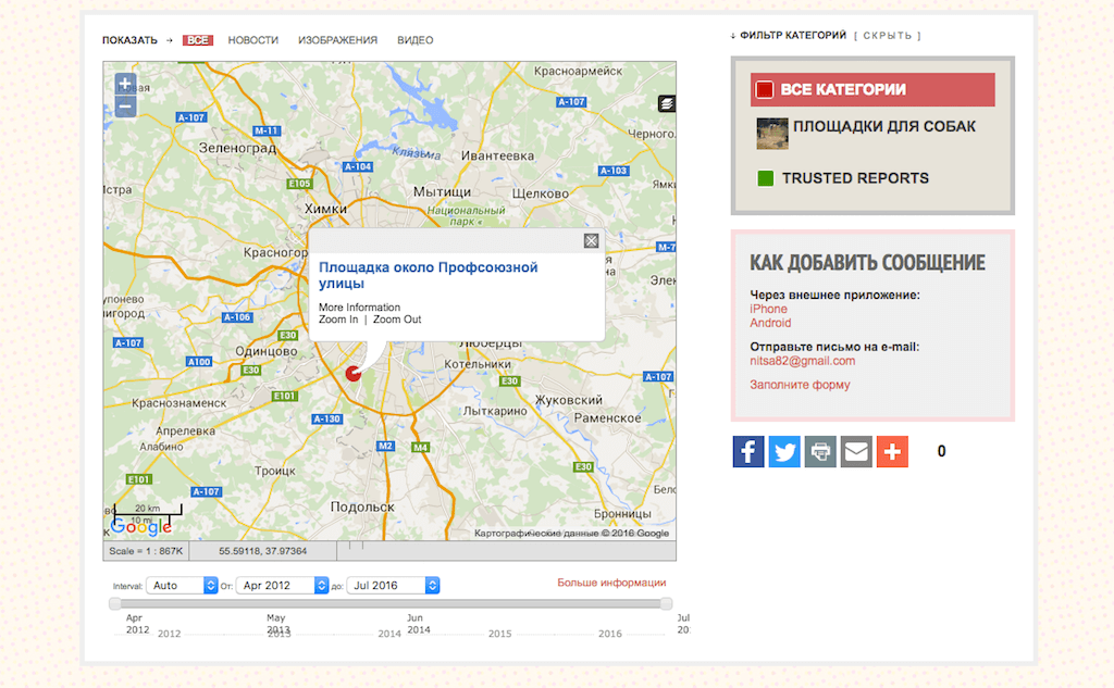 Как с помощью самих жителей города узнать о несанкционированных свалках или местах неправильной парковки автомобилей на газонах? Куда добавить информацию о новых площадках для выгула собак в вашем районе, чтобы о них узнали соседи? Как определить места наиболее частых автомобильных аварий в городе или выявить неблагоприятные улицы и районы по числу разбойных нападений? Как узнать о ямах на дорогах и отслеживать процесс ремонта дорог? Как собирать информацию о землетрясениях и наводнениях?