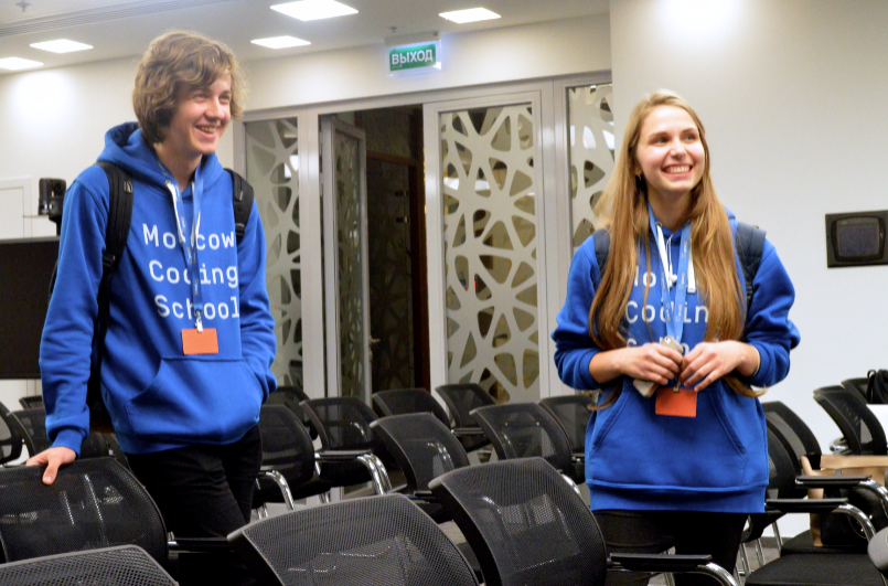 Александр Смирнов и Татьяна Тищенко, старшеклассники-выпускники Moscow Coding School, представили школу и поделились своим опытом обучения.