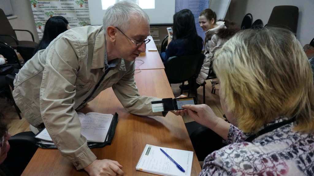 Олег наглядно продемонстрировал один из инструментов программы «Яндекс.Деньги», мобильный терминал для приема платежей: