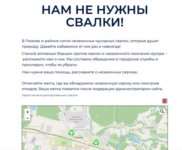 На сайте также установили плагин shMapper с картой Глазовского района. На ней любой житель может отмечать места с незаконными свалками или сжиганием отходов.